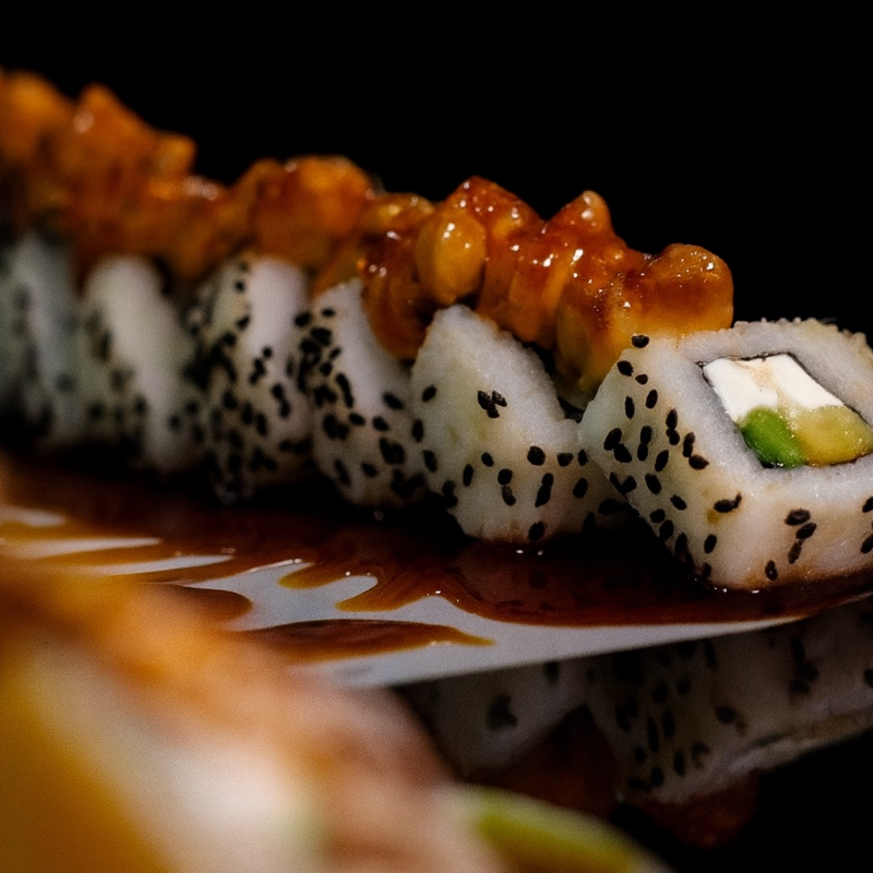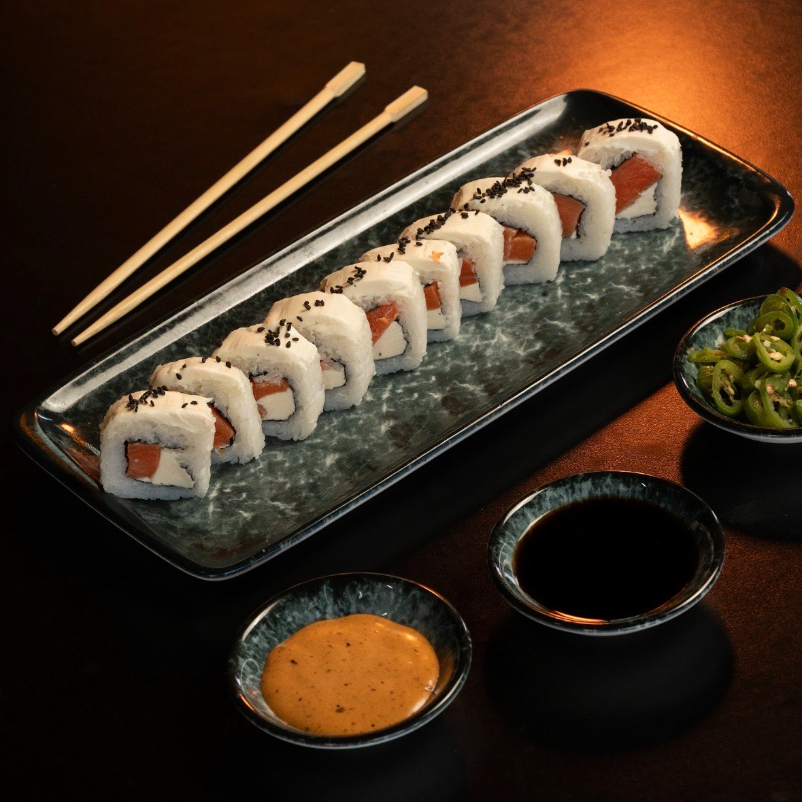 PD: Salmón fresco y queso Philadelphia. PF: Cubierto con ajonjolí y un toque de salsa teriyaki.