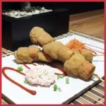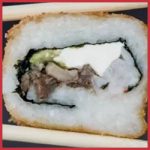 Arroz, philadelphia, aguacate y pollo, por dentro empanizada, por fuera bañada en salsa ranch y búfalo, cubierto de papitas adobadas.