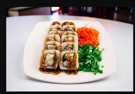 Camarón, Ostión, Aguacate, Philadelphia y Pepino natural bañado en Salsa de Anguila y Ajonjolí