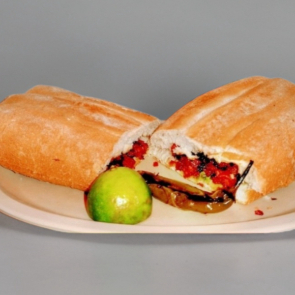 Exquisita, torta de BISTEC, CHORIZO Y QUESO, con una base de aguacate, jitomate y salsa chipotle, aderezada con mayonesa MC´CORMICK.