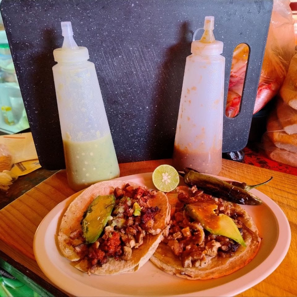 Exquisitos tacos con tortilla grande de bistec y chorizo con cebolla asada.