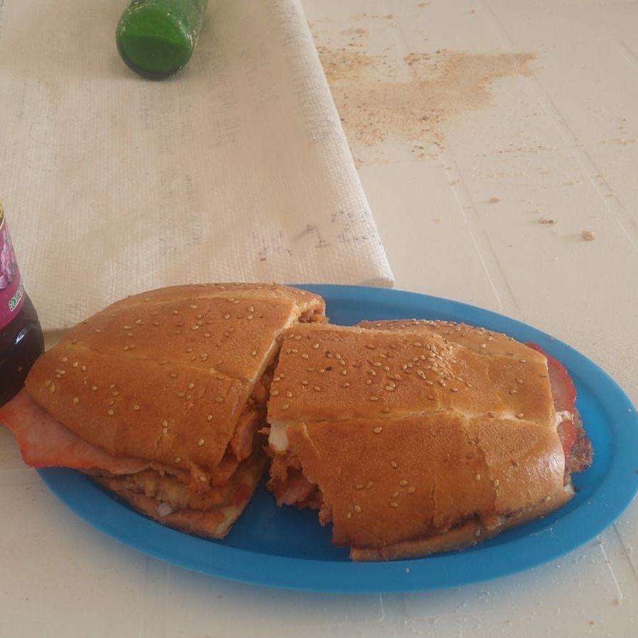 Milanesa, mayonesa, cebolla, jitomate, aguacate.