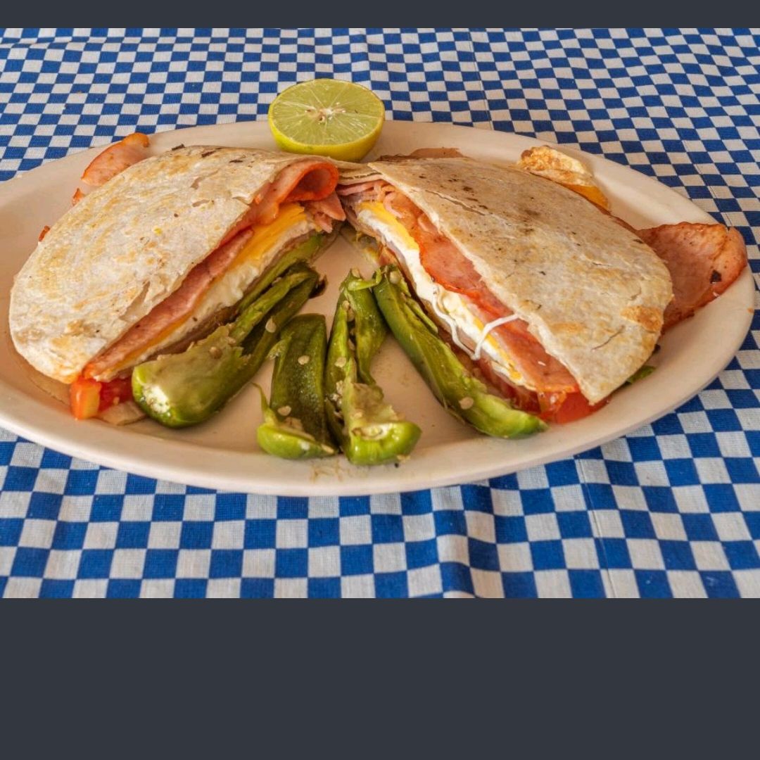 Huevo, queso oaxaca, mayonesa, cebolla jitomate, aguacate, picante.