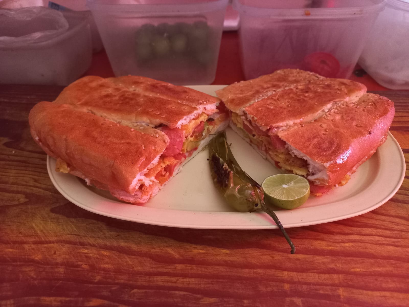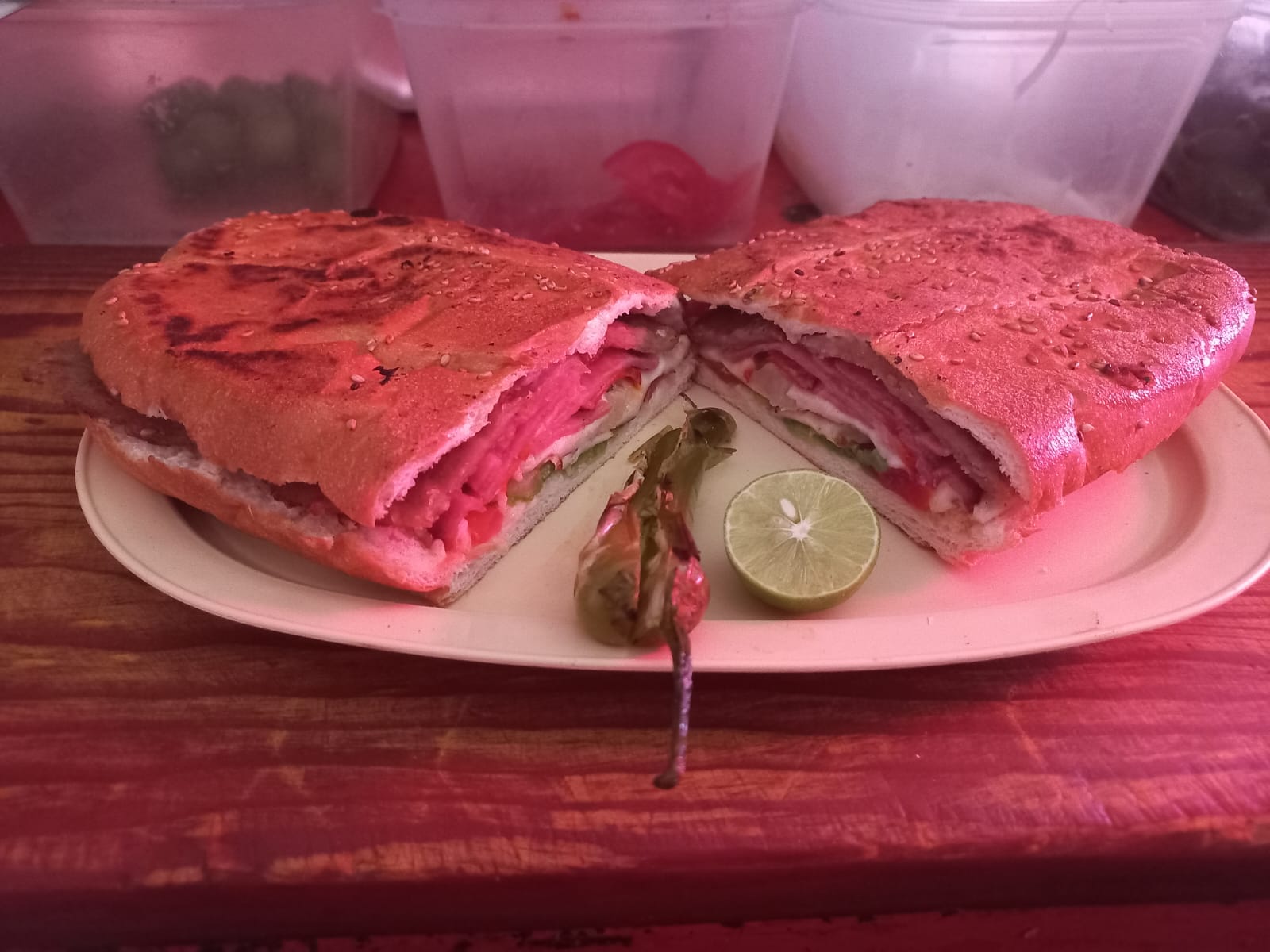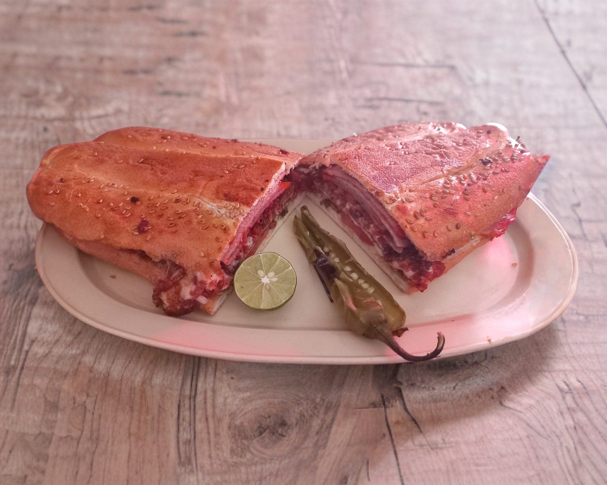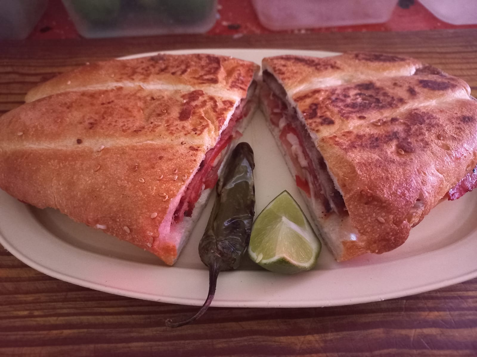 Pan grande de 28 cm de largo, lleva jitomate, aguacate, cebolla, mayonesa, salsa chipotle y chiles toreados aparte.