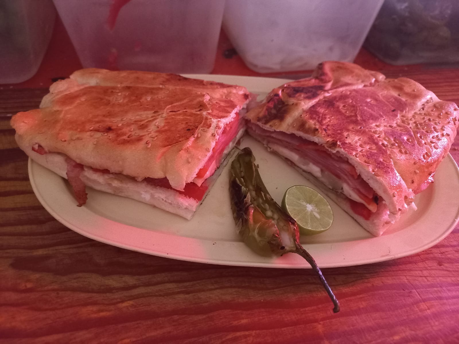 Pan grande de 28 cm de largo, lleva aguacate, jitomate, cebolla, salsa chipotle, pierna, huevo, queso oaxaca.