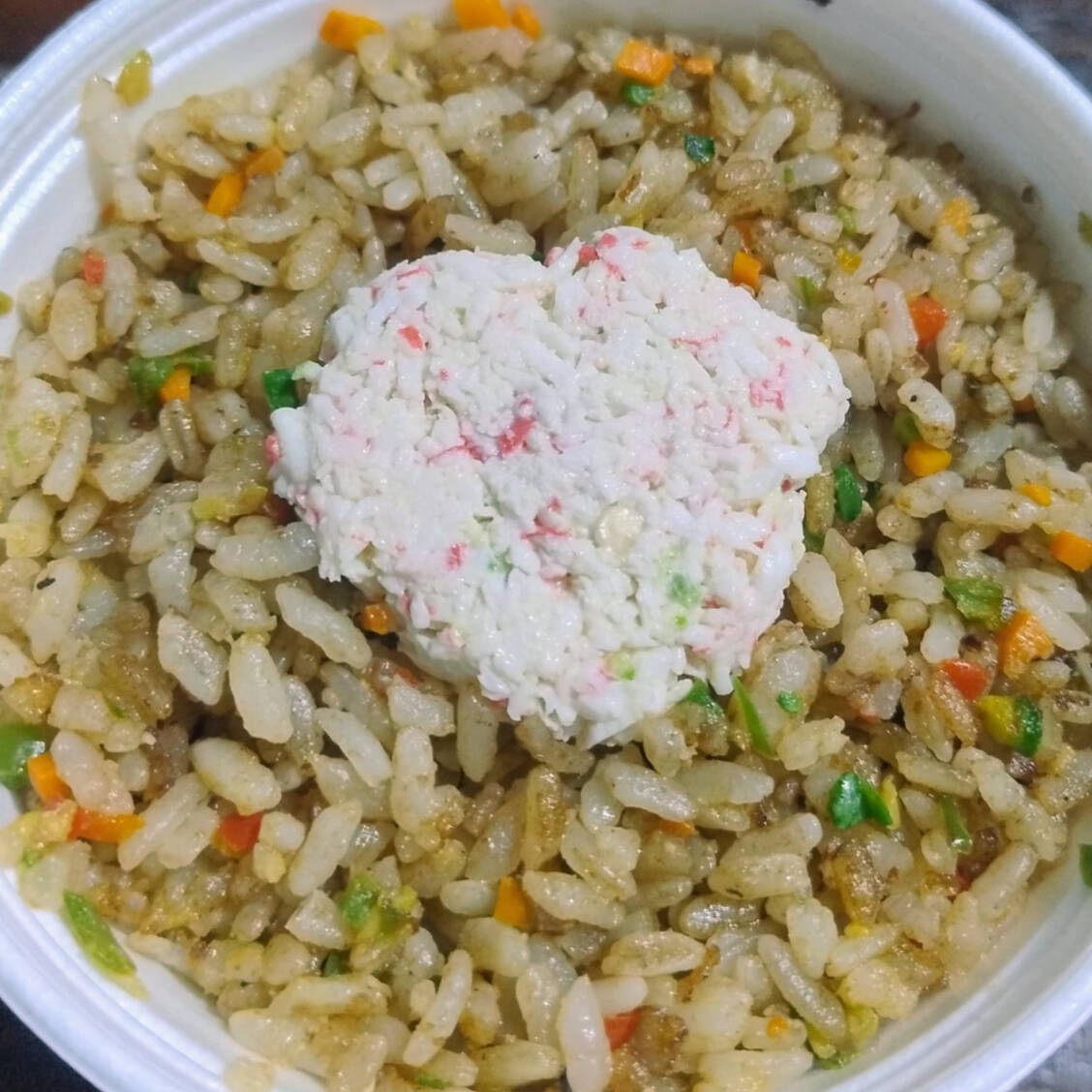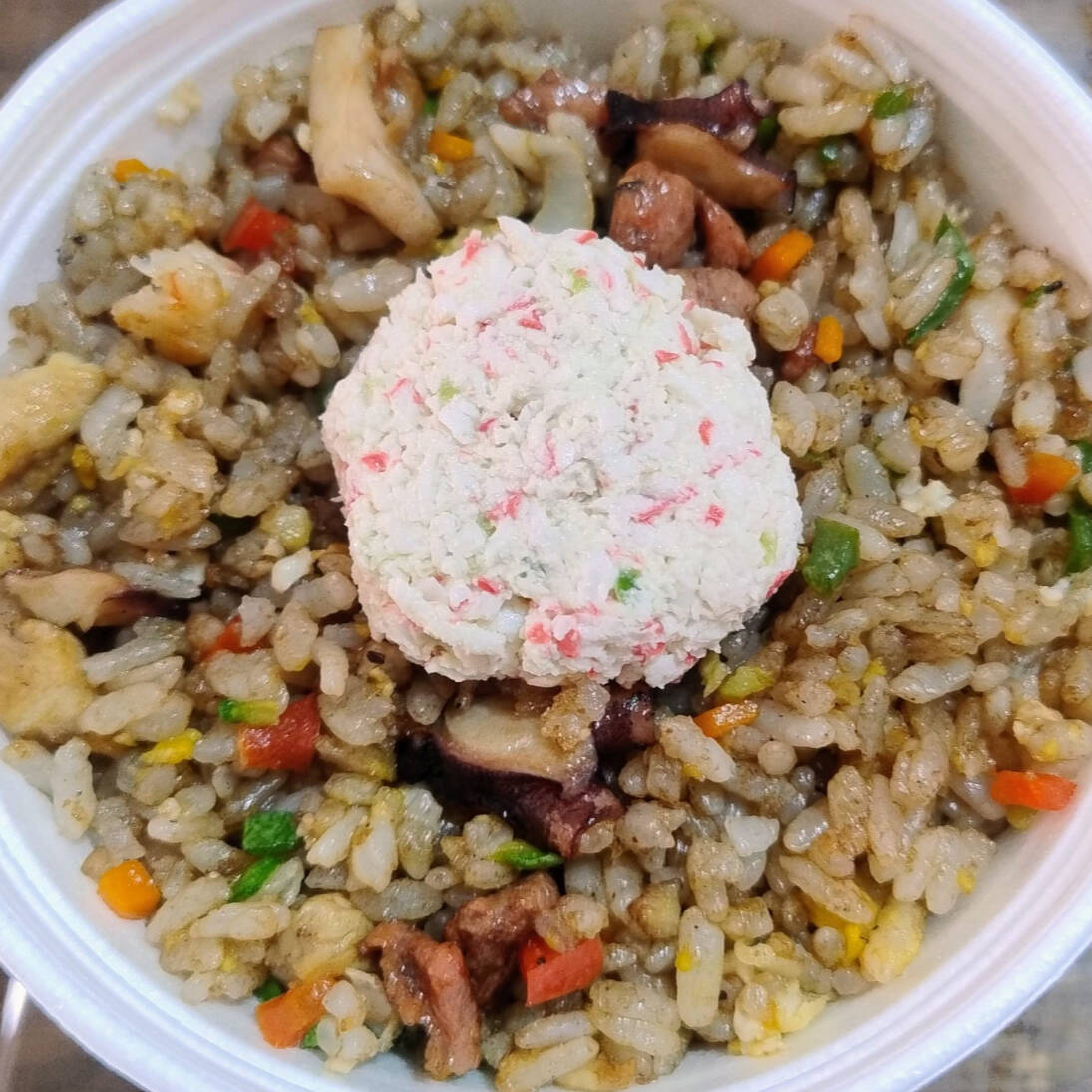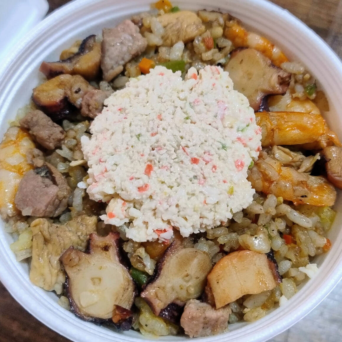 ARROZ FRITO SERVIDO CON ADEREZO DE TAMPICO, ZANAHORIA, CALABAZA, PIMIENTO, CEBOLLA, HUEVO, POLLO, PULPO Y CAMARON. ACOMPAÑADO CON SALSA DE SOYA