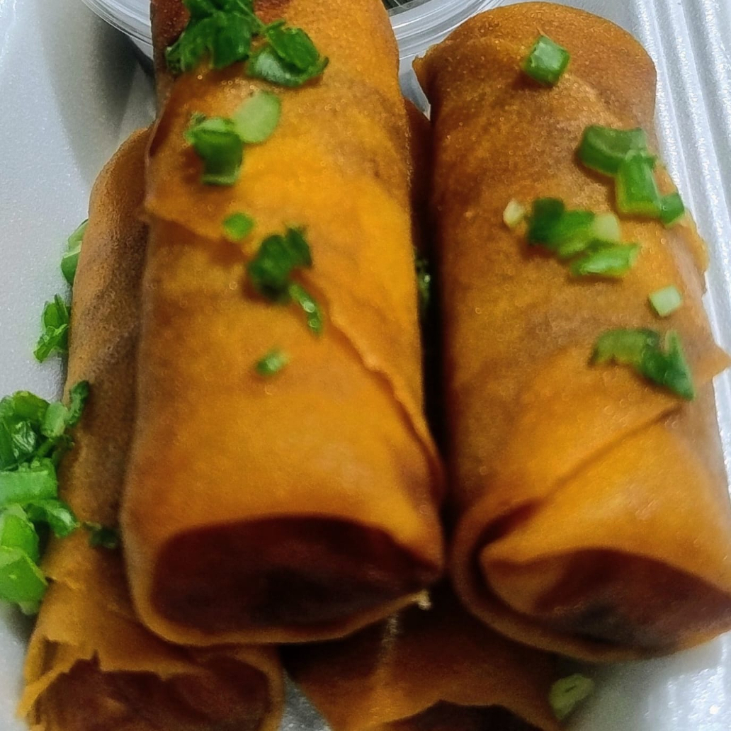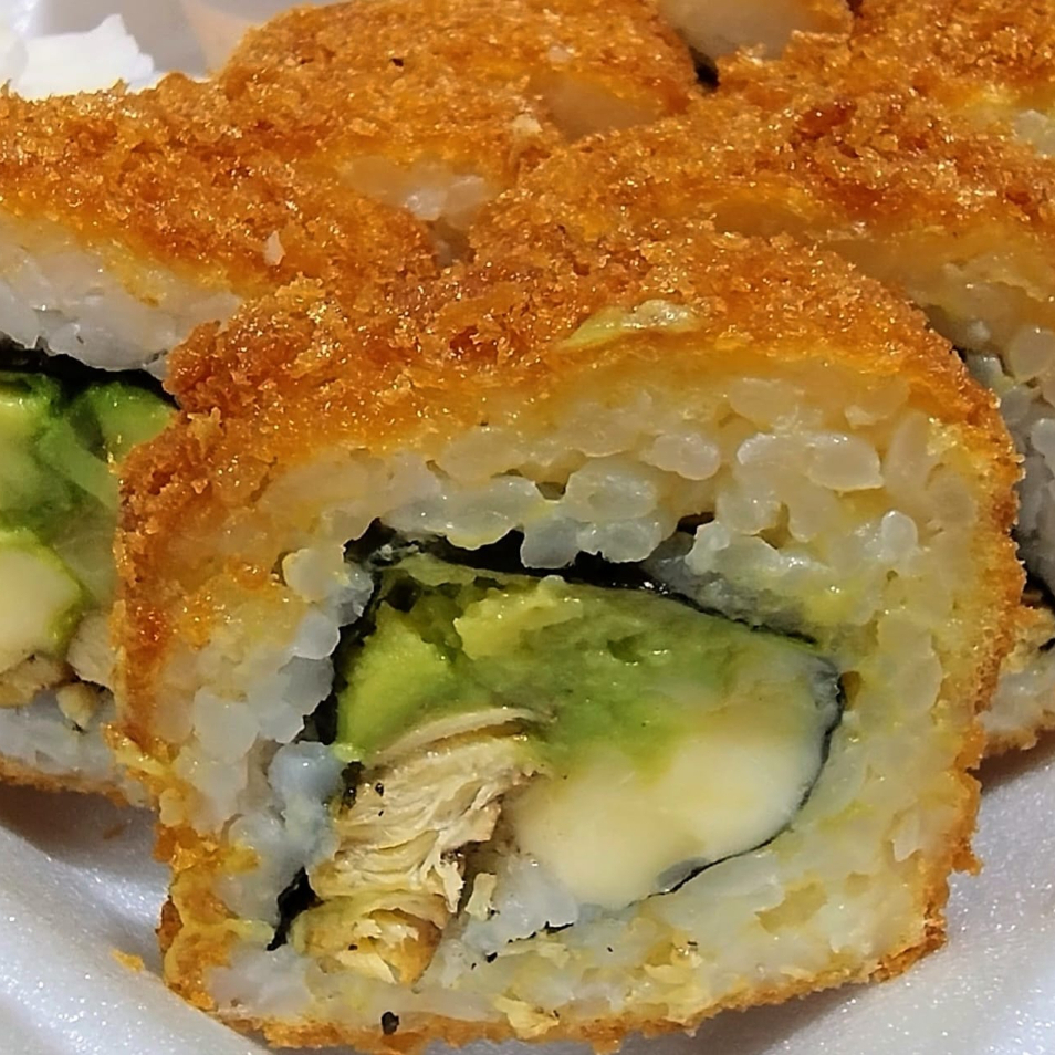 Empanizado relleno de pollo, agiacate y queso manchego, acompañado con salsa de soya y aderezo de chipotle jicama y zanahoria rayada.
