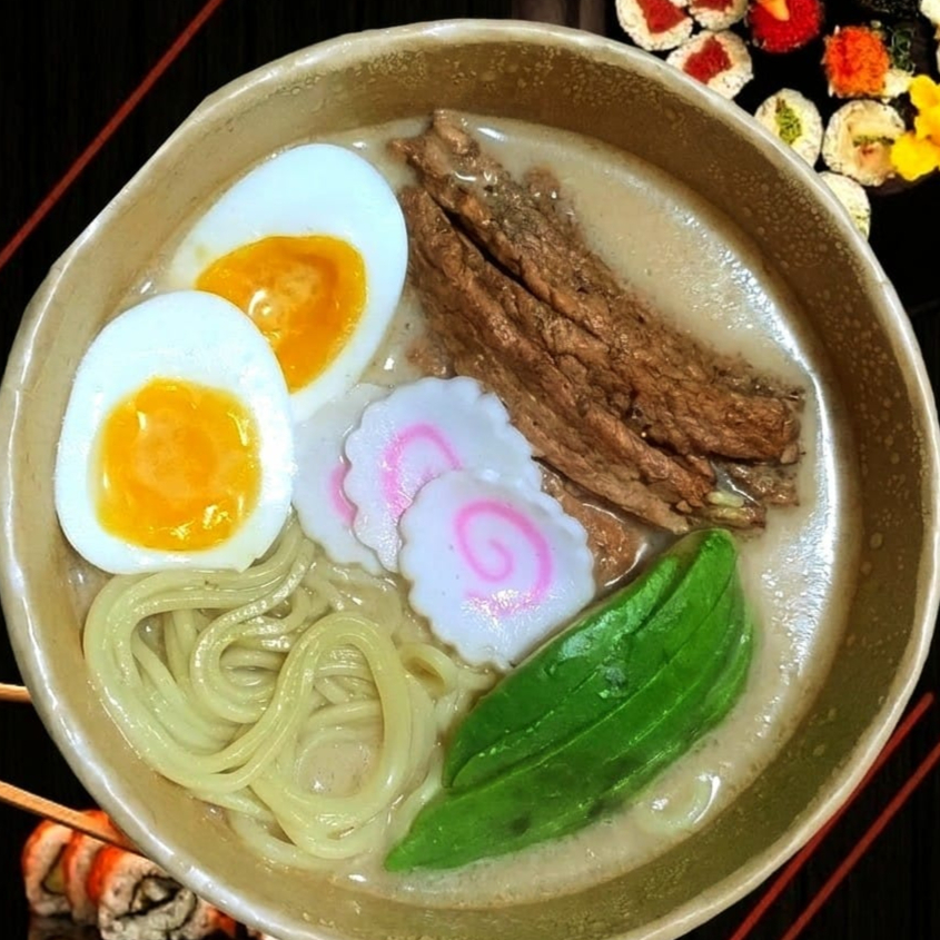 Caldo Tonkotsu, fideos japoneses Shimadaya 🇯🇵, Arrachera a la plancha 🇲🇽, Huevo Hanjuku (yema cremosa), Naruto y Aguacate.