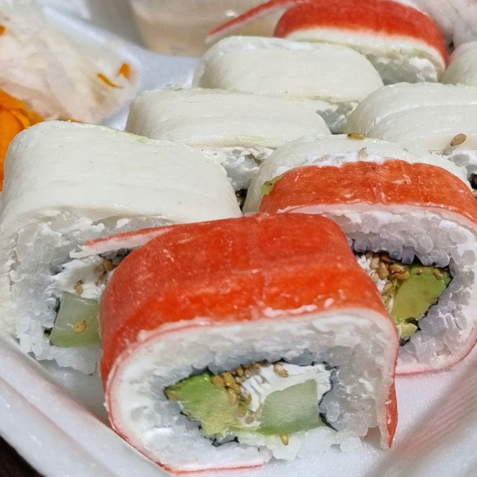 SURIMI POR FUERA, RELLENO DE AJONJOLÍ, PEPINO, QUESO CREMA PHILADELPHIA Y AGUACATE. ACOMPAÑADO CON SALSA DE SOYA, ZANAHORIA Y JÍCAMA RAYADA.
