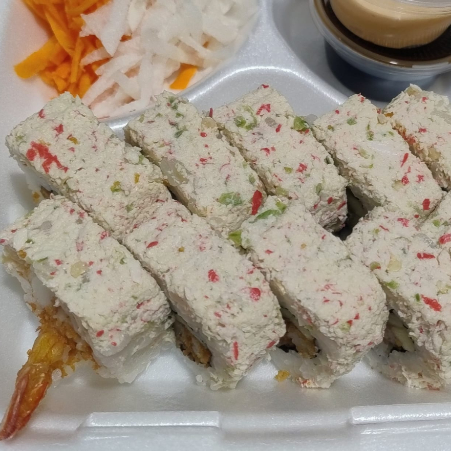 ADEREZO TAMPICO POR FUERA, RELLENO DE PEPINO Y CAMARÓN EMPANIZADO. ACOMPAÑADO CON SALSA DE SOYA, ZANAHORIA Y JÍCAMA RAYADA.