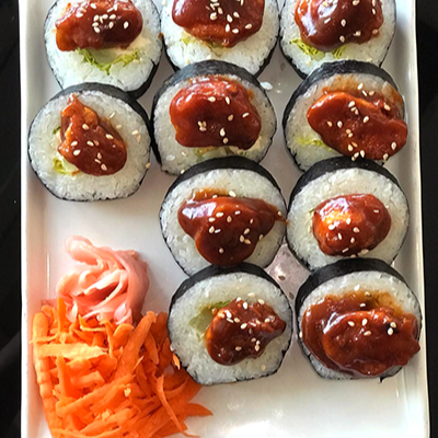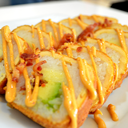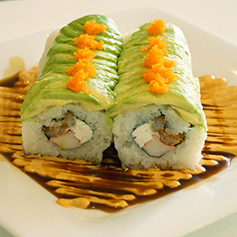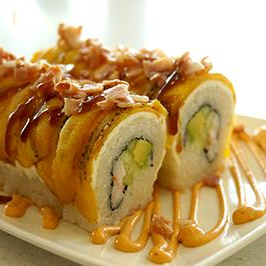 Dentro: Camarón, pepino y aguacate por fuera: Philadelphia, plátano macho, tocino y salsa de anguila