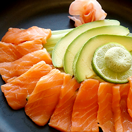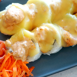 Salmon, Aguacate, philadelphia y pepino, por fuera: Camarón a la diabla y queso manchego horneado