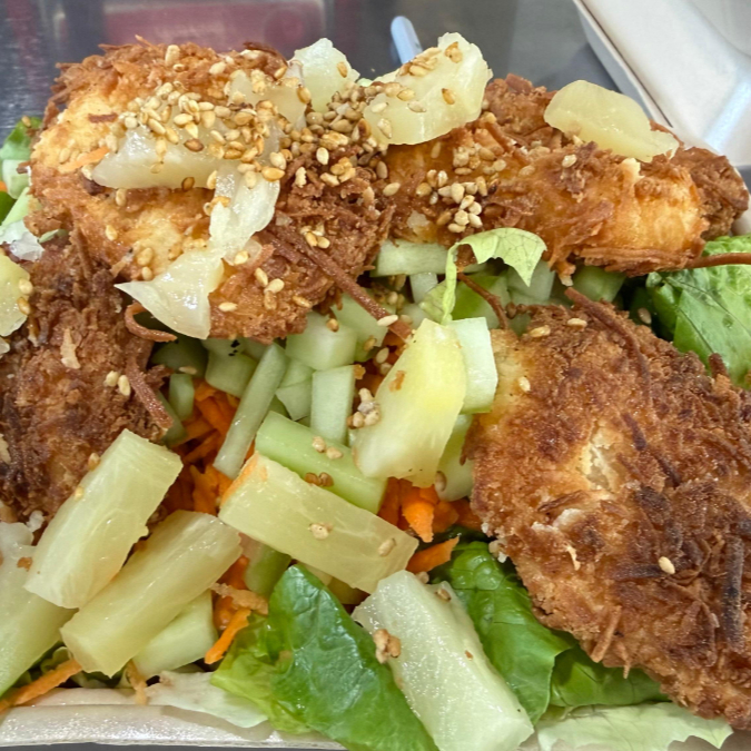 Lechuga, zanahoria, pepino, pollo picante, arroz y crotones