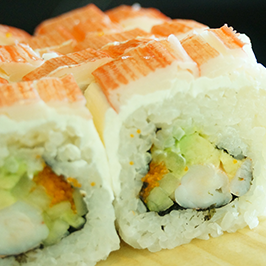 Camarón empanizado, cangrejo, philadelphia, aguacate y mazago