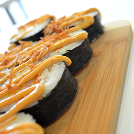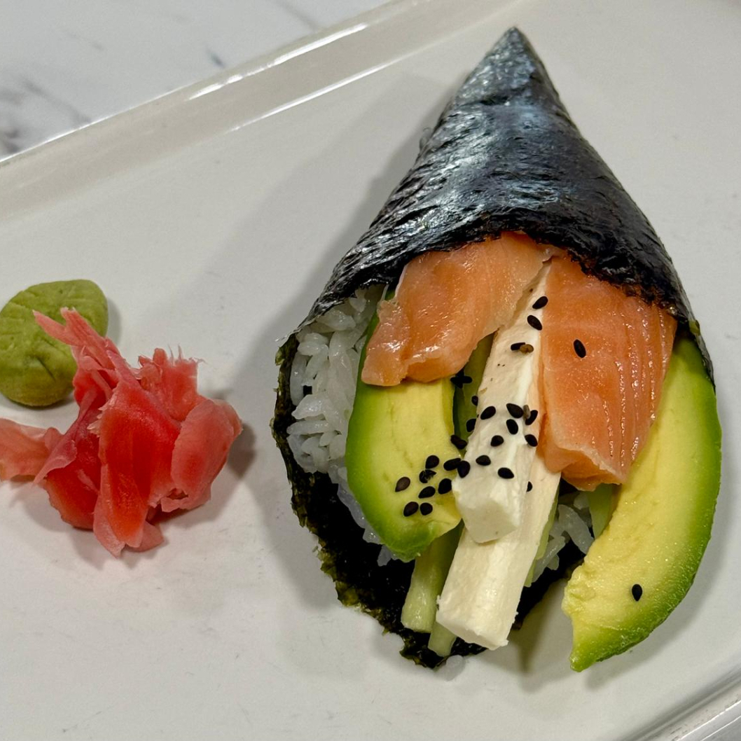 Delicioso cono de alga nori y arroz relleno de tu proteína favorita. ¡El bocado perfecto para empezar!