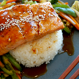 Vegetales salteados con tu proteína a elegir sobre una cama de arroz y deliciosa salsa teriyaki