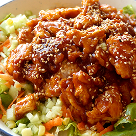 Tozoa de pollo capeados, bañados en salsa picosita estilo bbq
