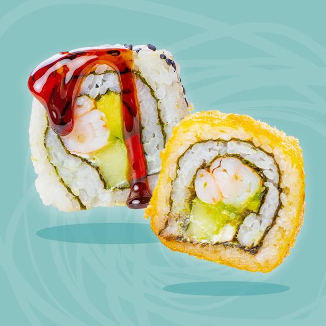 Sushi de camarón, pepino, aguacate y queso crema, por fuera va capeado.