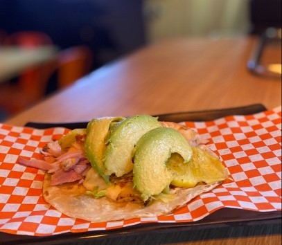 Servida con lechuga, jitomate, cebolla, salsa de mango, aguacate, costra de queso y ensalada de col. Acompañado de papas fritas.
