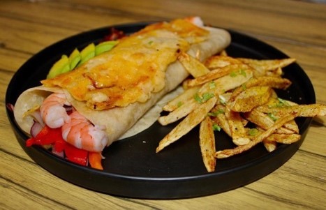 Camarones salteados con tocino, pimiento morrón, cebolla morada, aderezo de la casa, costra de queso, acompañado de papas fritas.