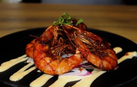 Camarones salteados con tocino, pimiento morrón, cebolla morada y costra de queso.