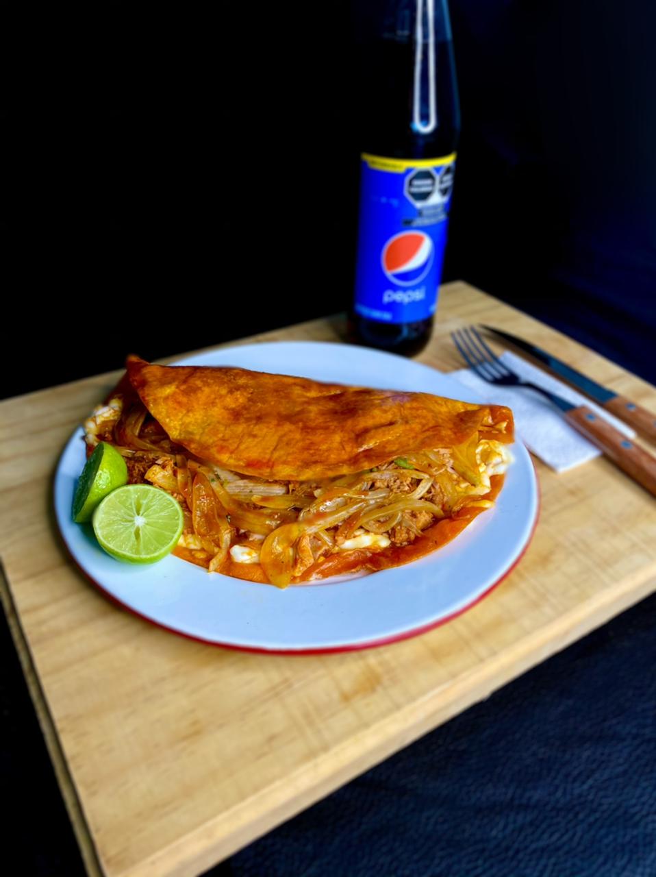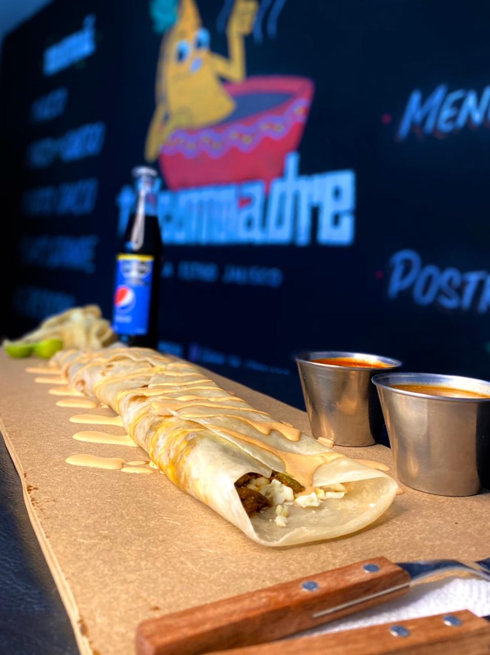 Medio metro de tortilla de harina, frijoles refritos, queso oaxaca, birria de res, cebolla asada, aguacate y aderezo de chipotle.