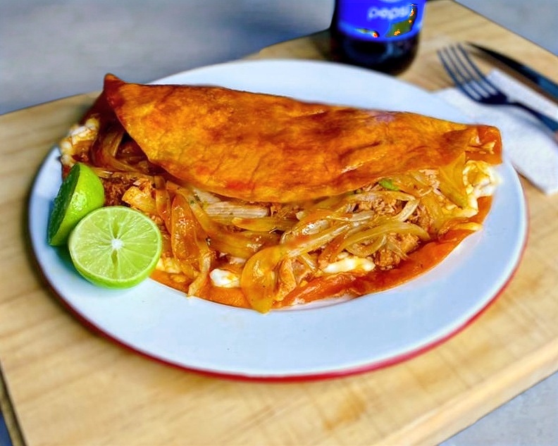 TOTOPO BAÑADO EN SALSA DE JITOMATE (NO PICA) CON POLLO, CREMAY QUESO RANCHERO.