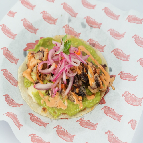 Chicharrón de pulpo (80 gm) costra de queso Oaxaca, cama de guacamole, cebolla morada encurtida y brote de cilantro.