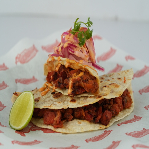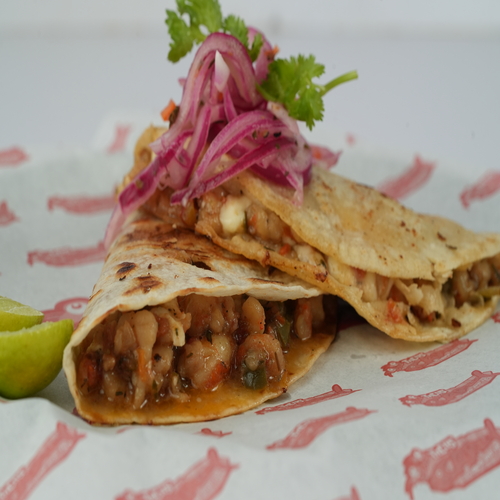 Guiso de camarón a la mexicana (90 gm) (jitomate, cebolla, aceite de matcha, ajo y especias) y queso Oaxaca.