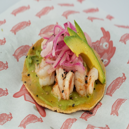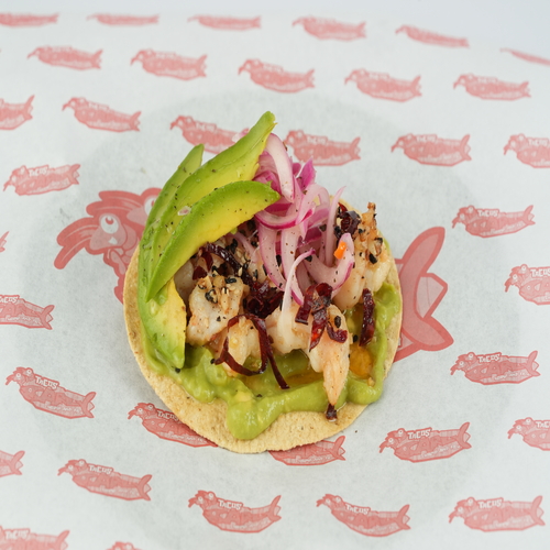 Camarones a la diabla (5 pzas) cama de guacamole, abanico de aguacate, decoración de ajonjolí mixto tostado, cebolla morada encurtida y brote de cilantro.