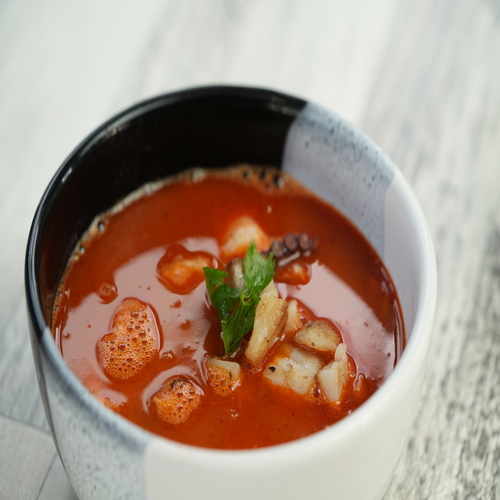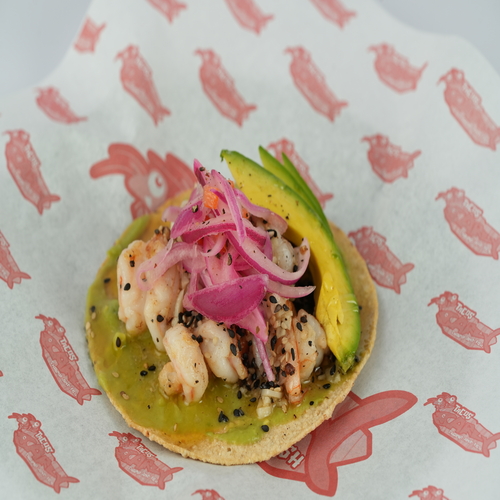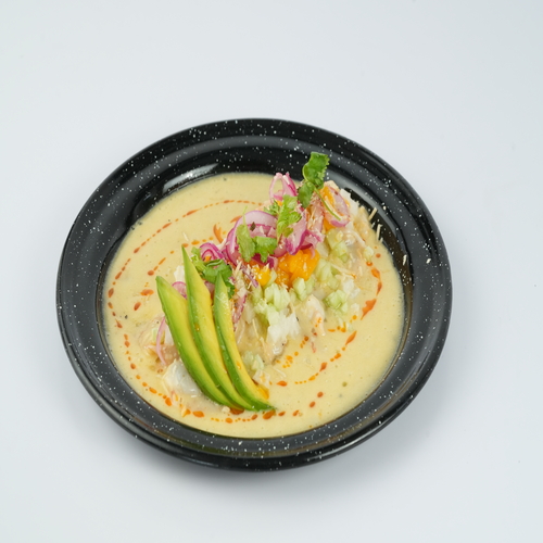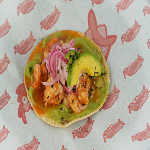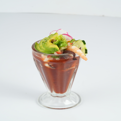 A base de salsa coctelera de la casa o caldo de camarón, acompañado de jitomate, cebolla, cilantro, chile cuaresmeño y aguacate.