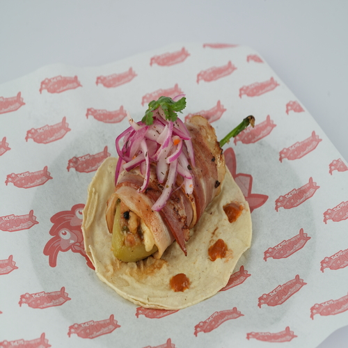 Chile caloro relleno de guiso gobernador de camarón a la mexicana y queso Oaxaca, envuelto en tocino.