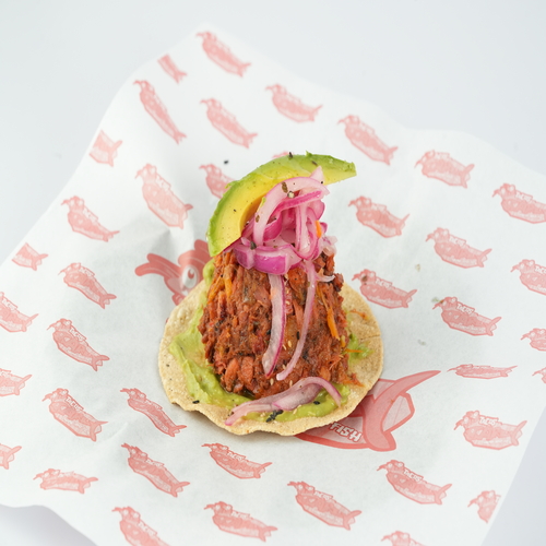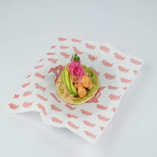 Chicharrón de salmón (80 gm) costra de queso Oaxaca, cama de guacamole, cebolla morada encurtida y brote de cilantro.