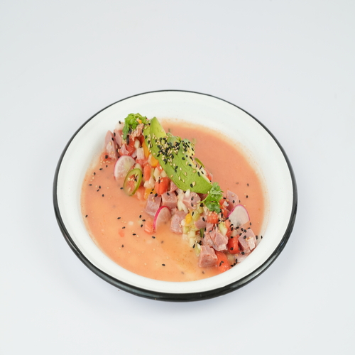 Atun (100 gm), sandia en cubos, mango, jicama, aguacate, rábano, ajonjolí mixto tostado y salsas de la casa.