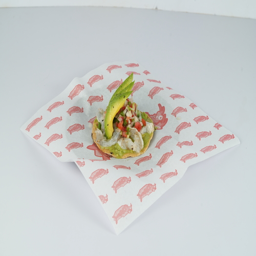 Pescado blanco (80 gm) cama de guacamole, abanico de aguacate, pico de gallo, aceite de oliva y brote de cilantro.