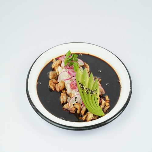 Pulpo marinado en casa (80 gm) cama de guacamole, abanico de aguacate, aderezo chipotle, cebolla morada encurtida y brote de cilantro.