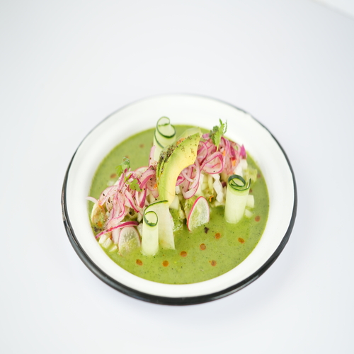 Camarones en mariposa (100 a 120 gm), salsa de aguachile verde receta de la casa, acompañado con aguacate, pepino, jícama, cebolla morada y ceniza de habanero.