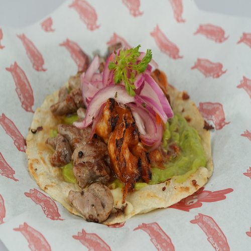 Camarón con salsa diabla y arrachera (100 gm) costra de queso Oaxaca, cama de guacamole, cebolla morada encurtida y brote de cilantro.