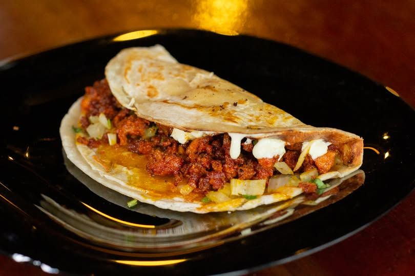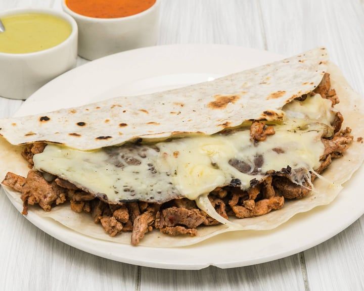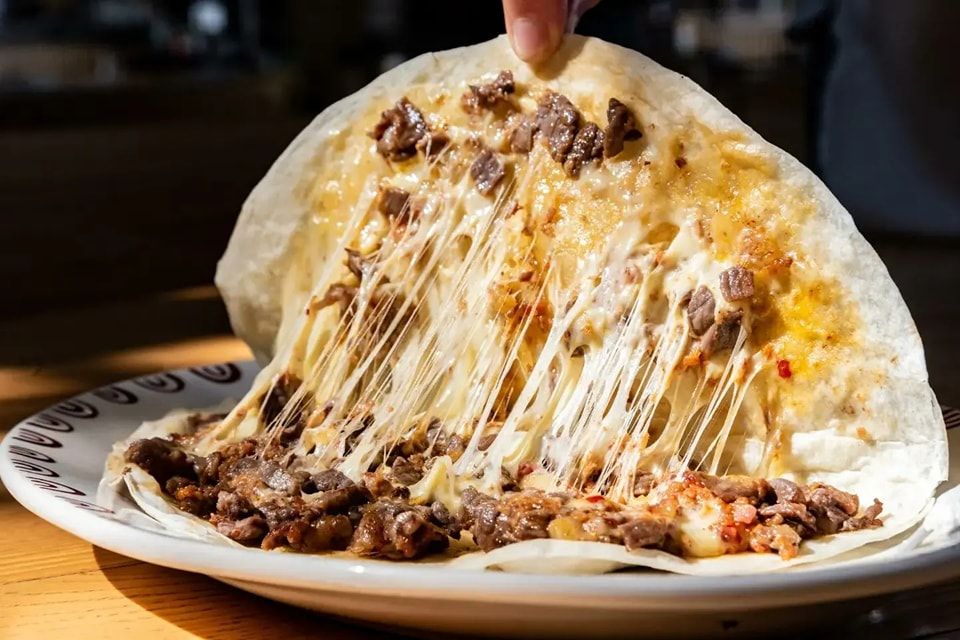 Exquisita gringa campechana con queso Oaxaca en tortilla de harina de tamaño normal.