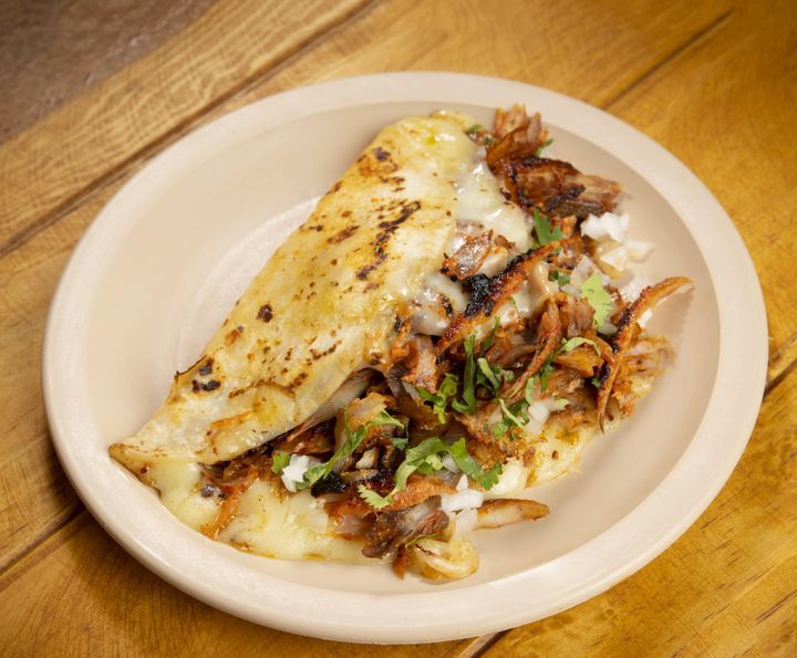 Exquisita gringa de pastor con queso Oaxaca en tortilla de harina de tamaño normal