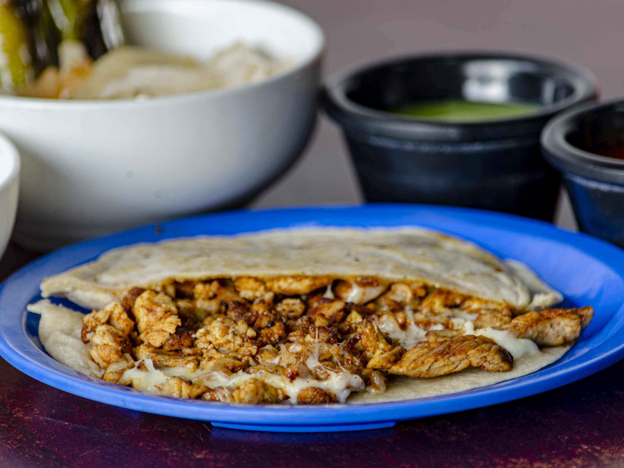 3 Tortillas harina, chorizo, queso oaxaca, cebolla frita.