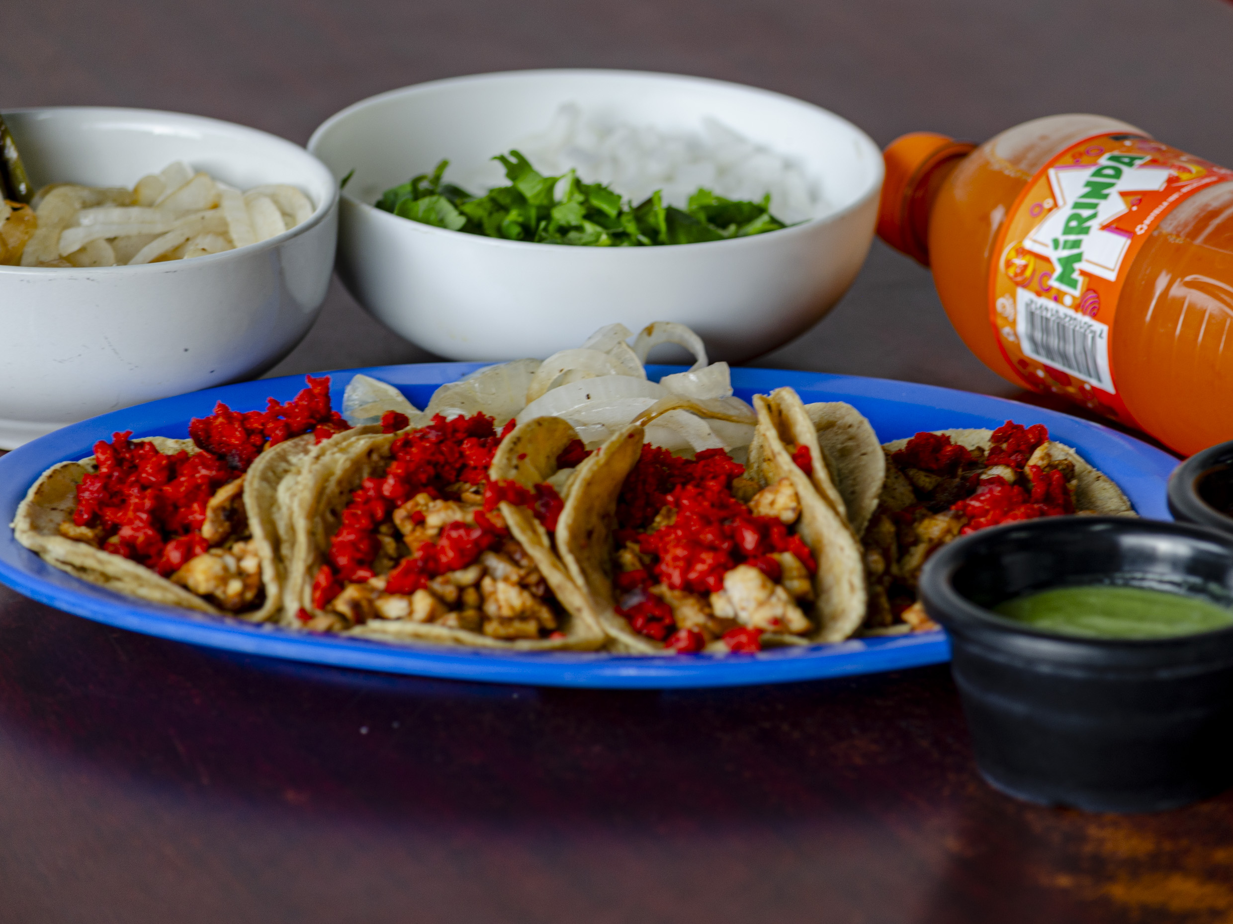 4 tacos bistec adobado cebolla frita, refresco. 600,salsas y limones