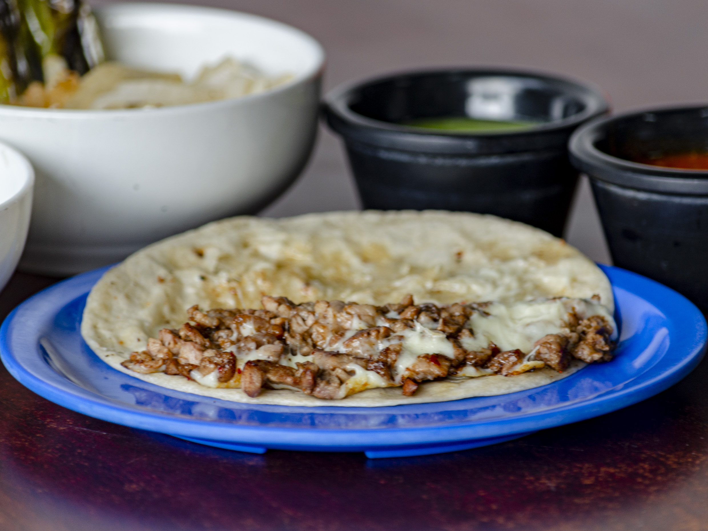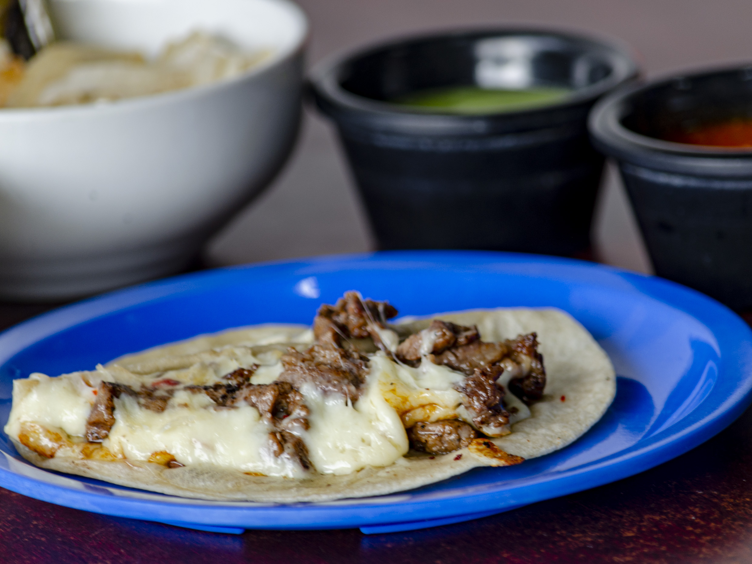 3 Tortillas harina, bistec, queso Oaxaca. Y cebolla frita