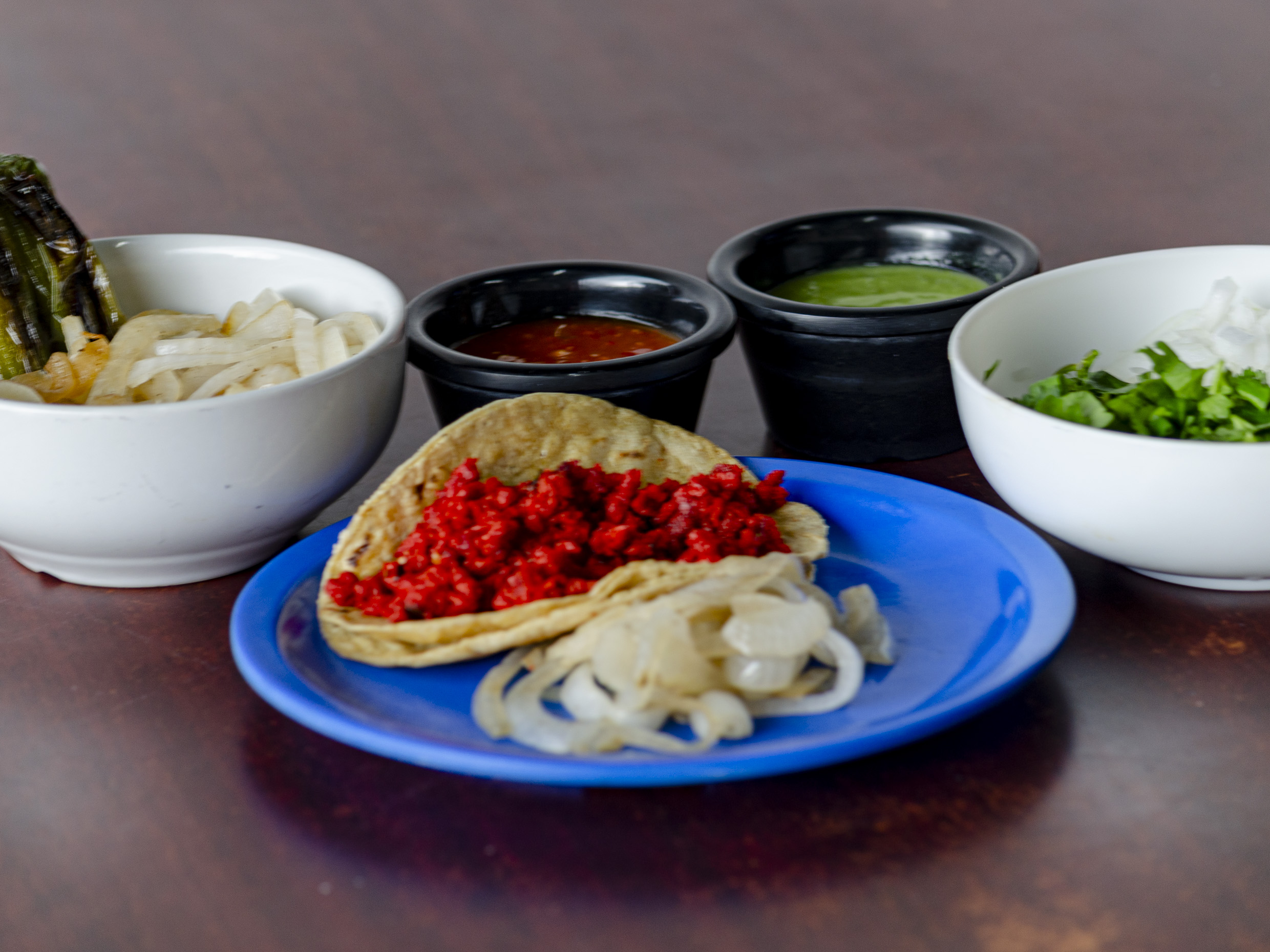 Cebolla asada, salsa, tortillas, limón y carne.