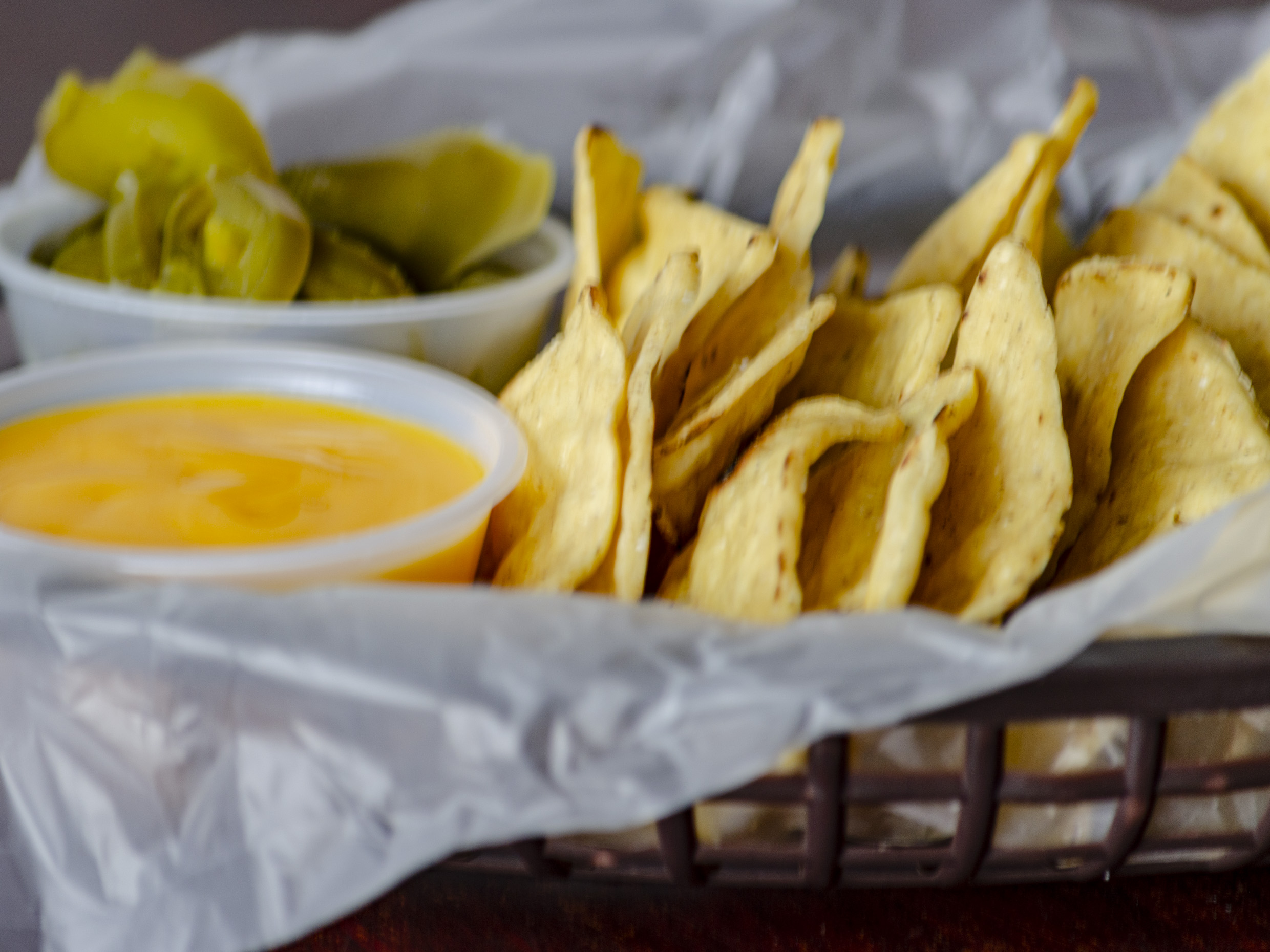 Tostitos con queso, arrachera, rodajas de jalapeños.