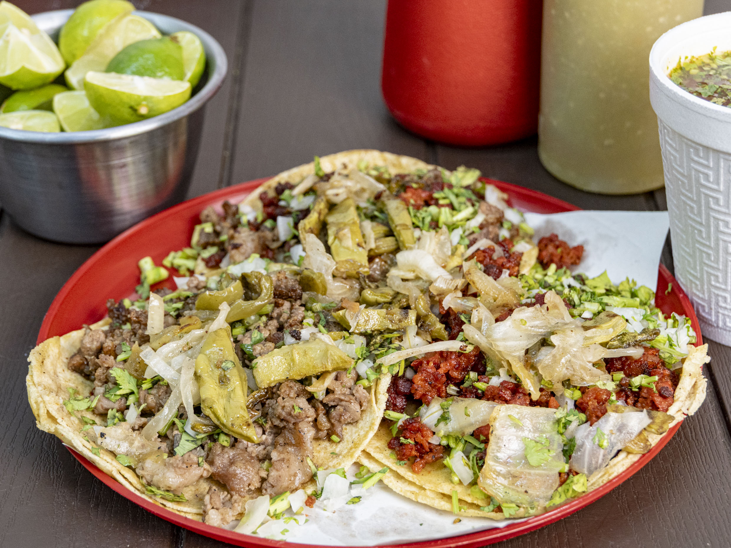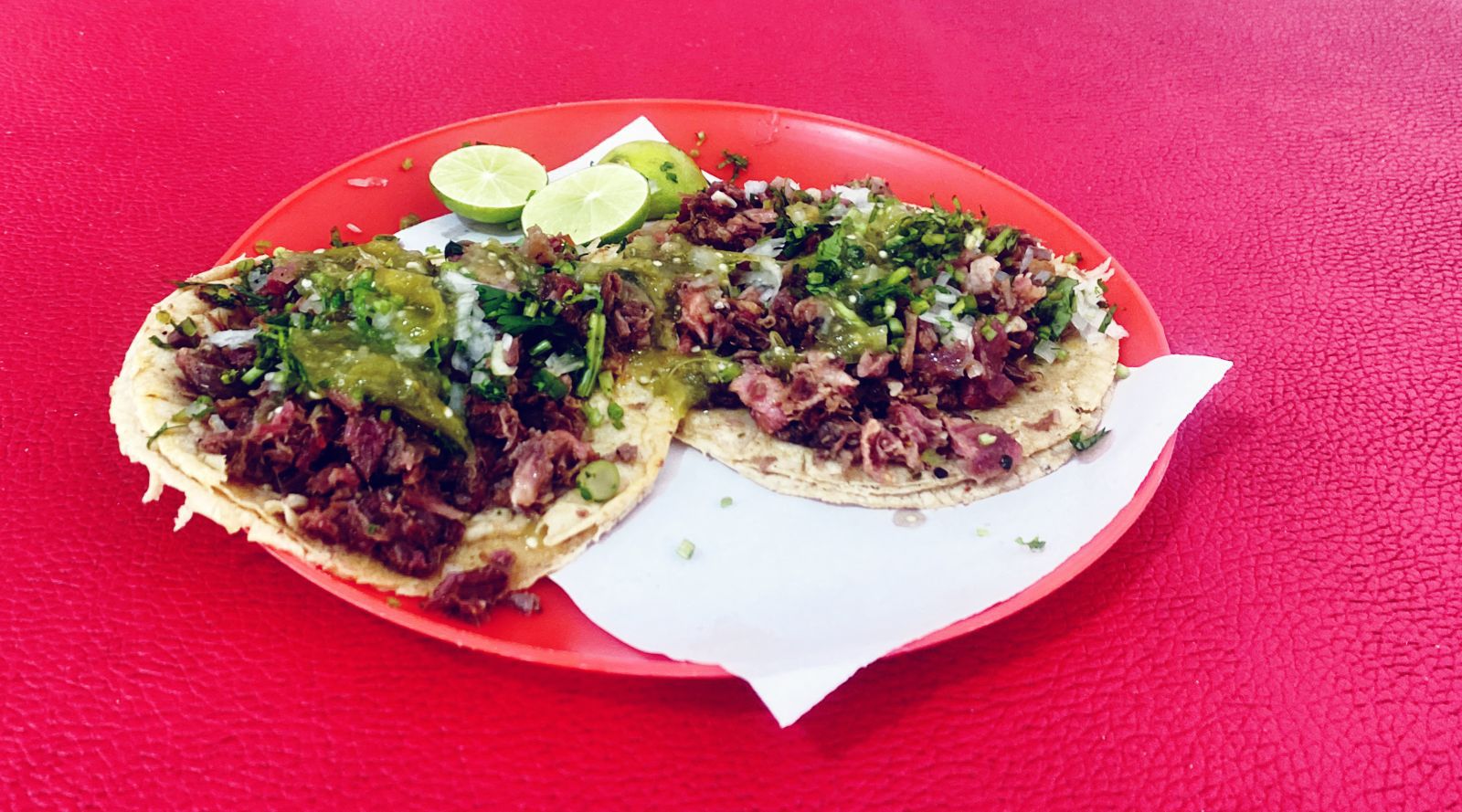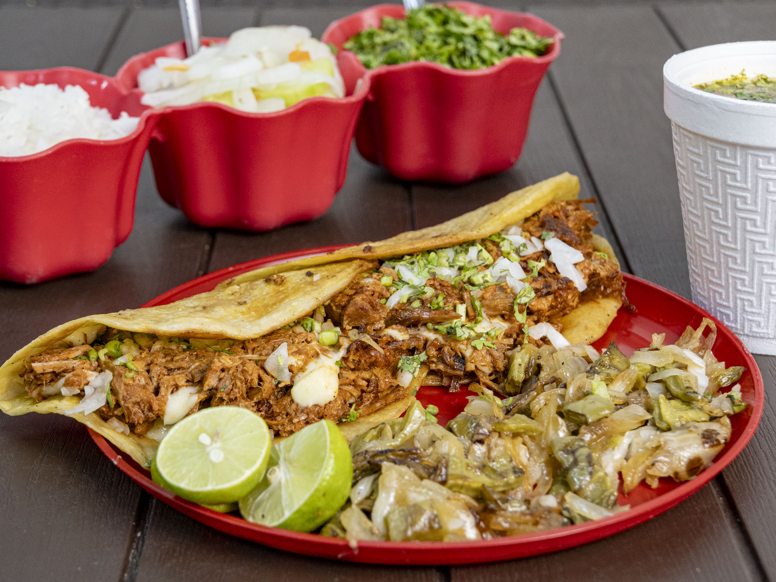 Dos tortillas de maíz, nopales, cebolla, cilantro, consomé, salsa verde o roja. Limones, ensalada de pepino, cebolla y habanero.