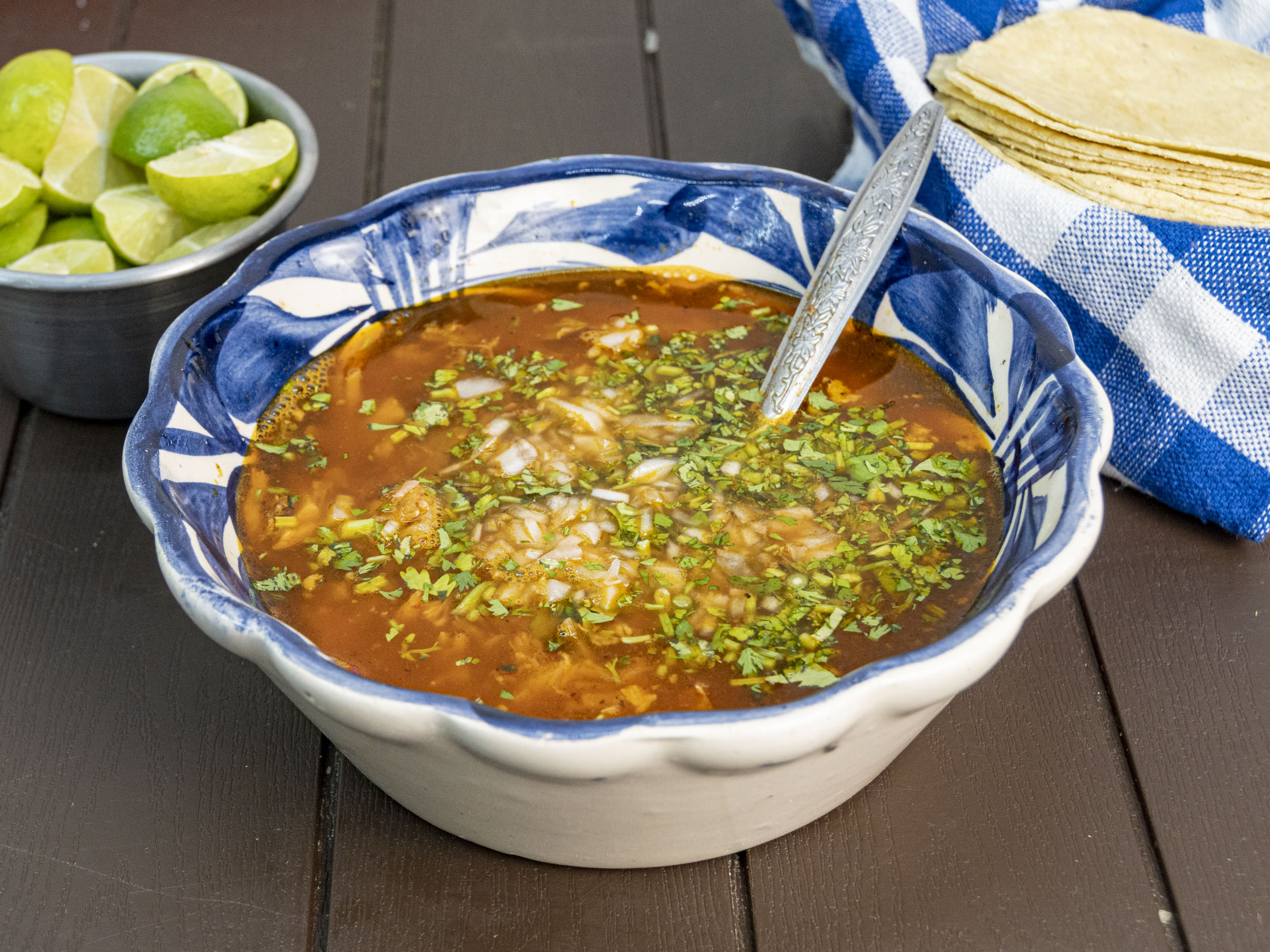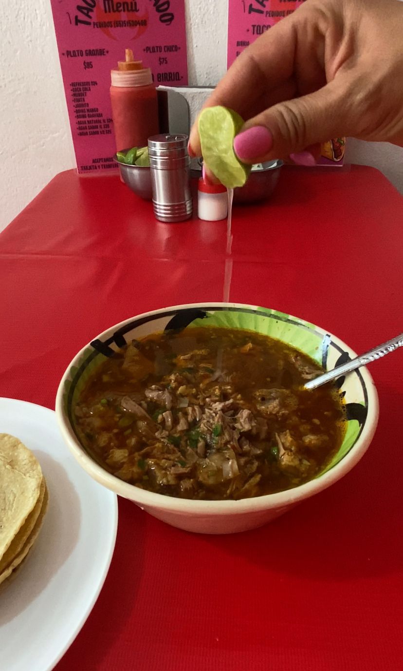 Acompañada de 1 L y 1/2 de consomé, salsa verde y roja, verdura, ensalada, limones y 1 kg de tortillas.