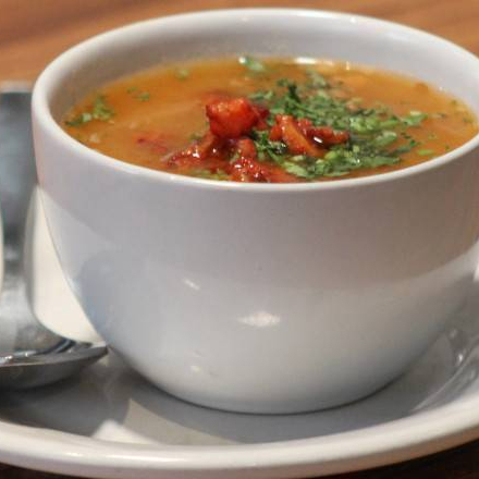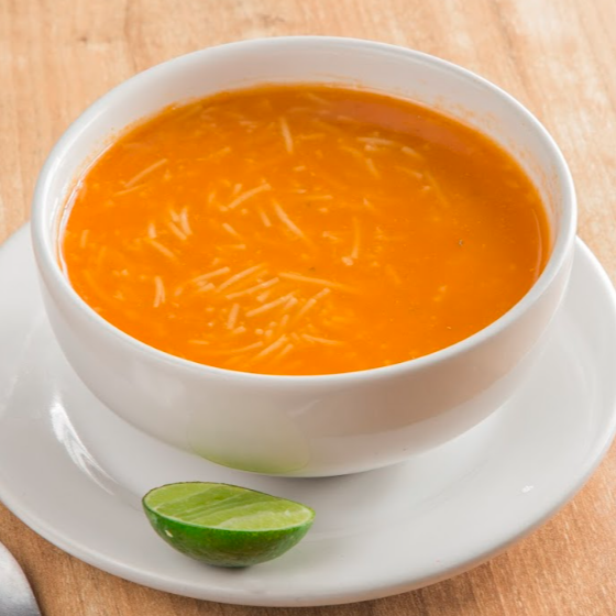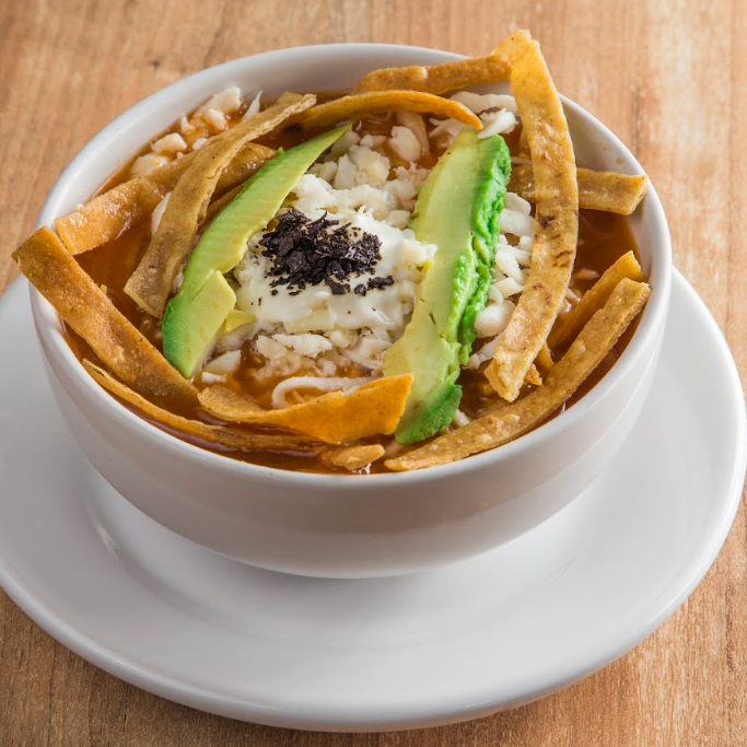 Caldillo de jitomate con un toque de chipotle, acompañado de fritura, queso, crema, aguacate un toque de chile pasilla. 350 g.