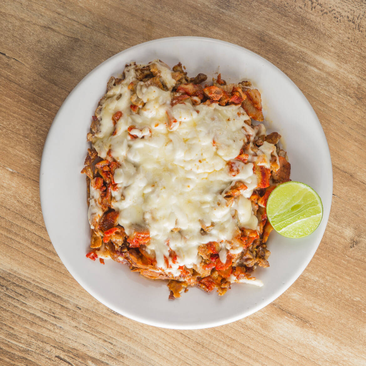 Tortilla tostada con una capa de 30 gramos de queso derretido y 40 gramos de la proteína de su elección.