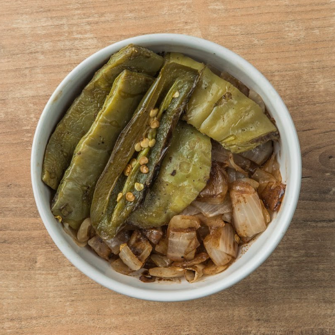 Cebollita acitronada y sazonada con jugo maggie y salsa inglesa, acompañadas con una porción de nopales y chiles toreados.